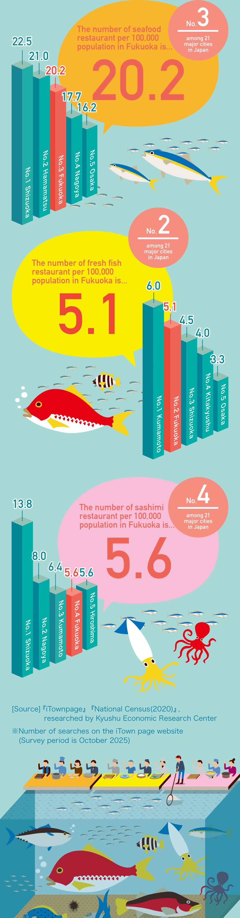The number of fresh fish restaurants per 100,000 population in Fukuoka is 12.4. No.2 among 21 major cities in Japan. No.1 Kumamoto 11.8,No.2 Fukuoka 11.7, No.3 Kitakyushu 7.6,No.4 Shizuoka 6.3,No.5 Okayama 5.8.